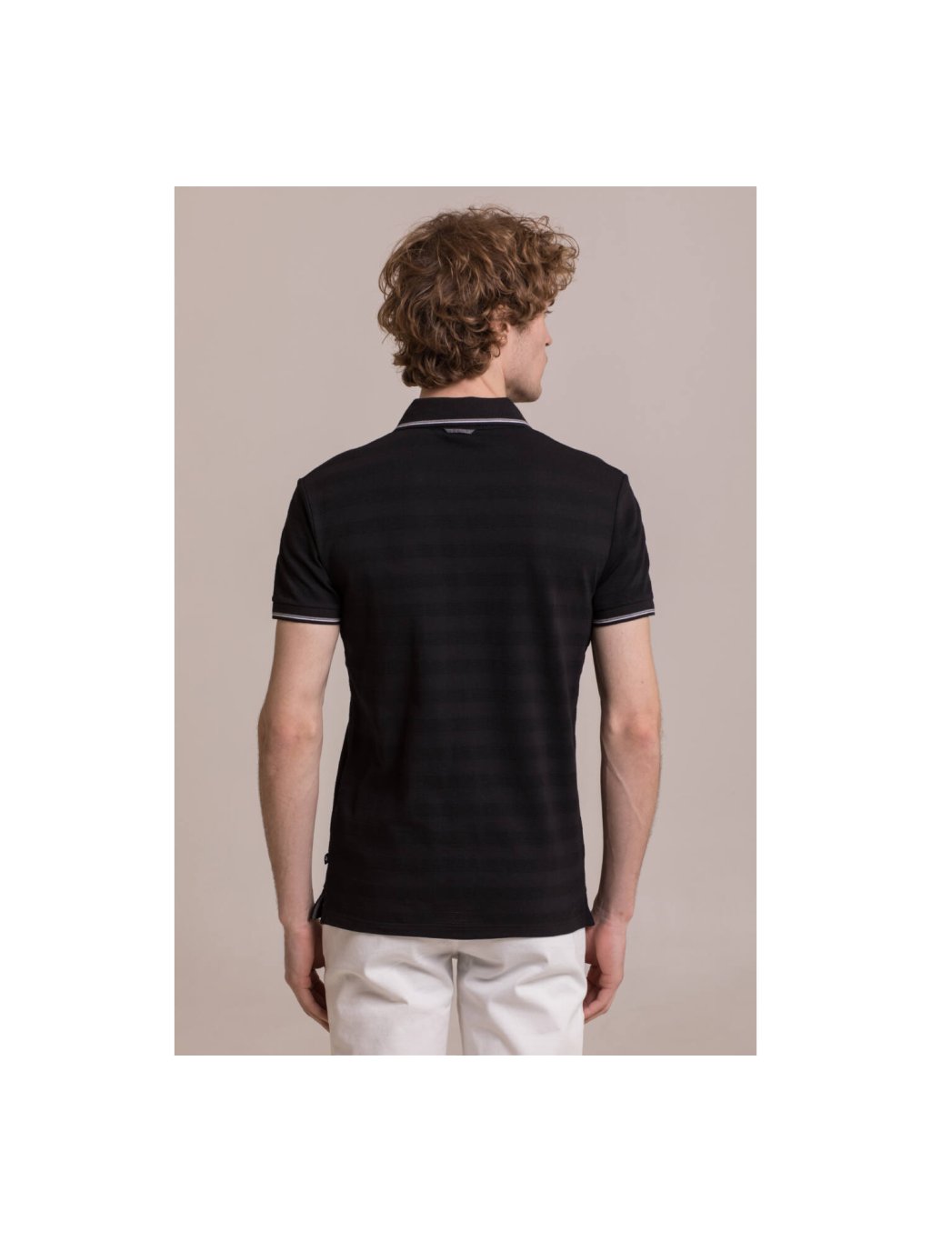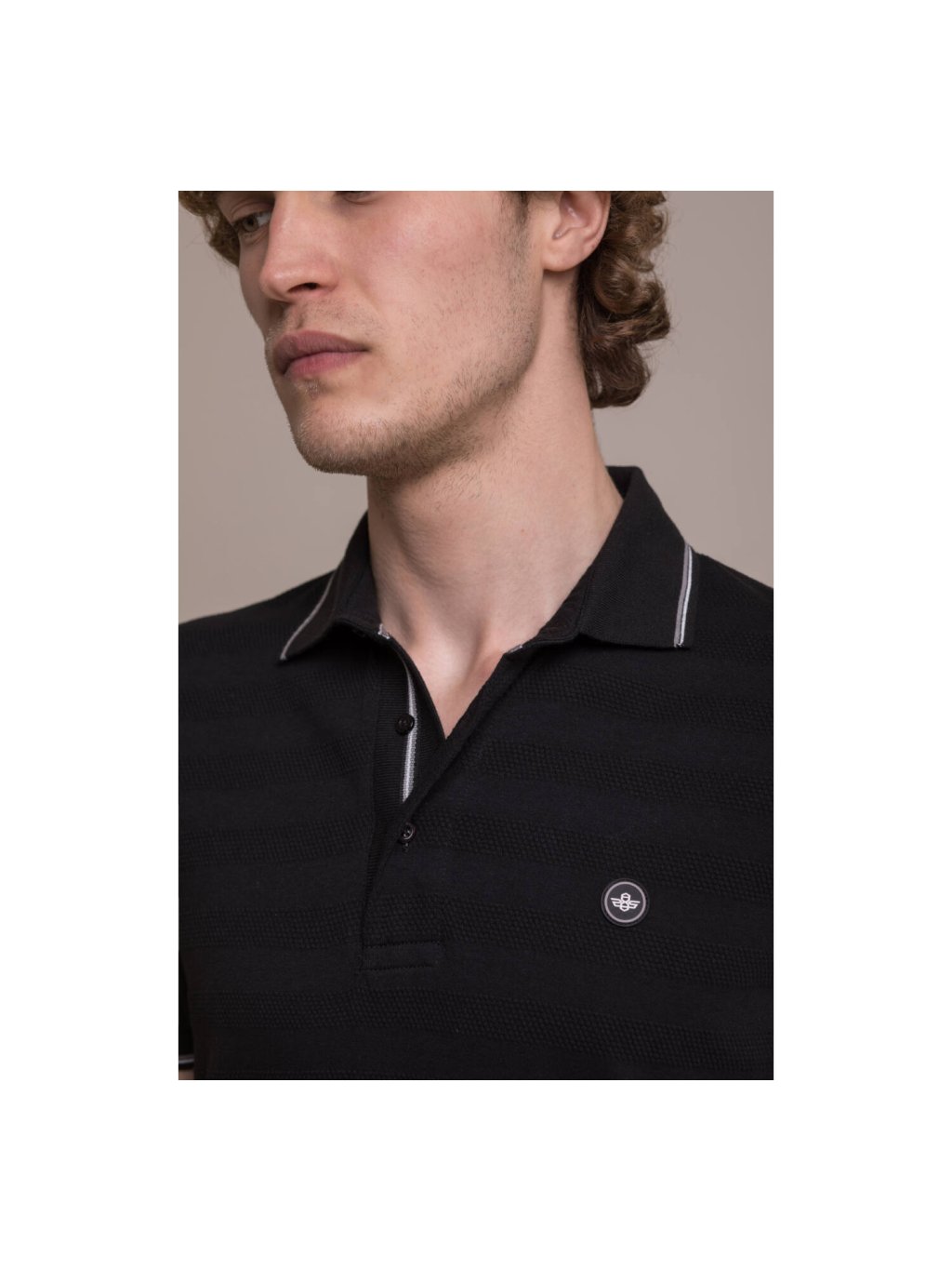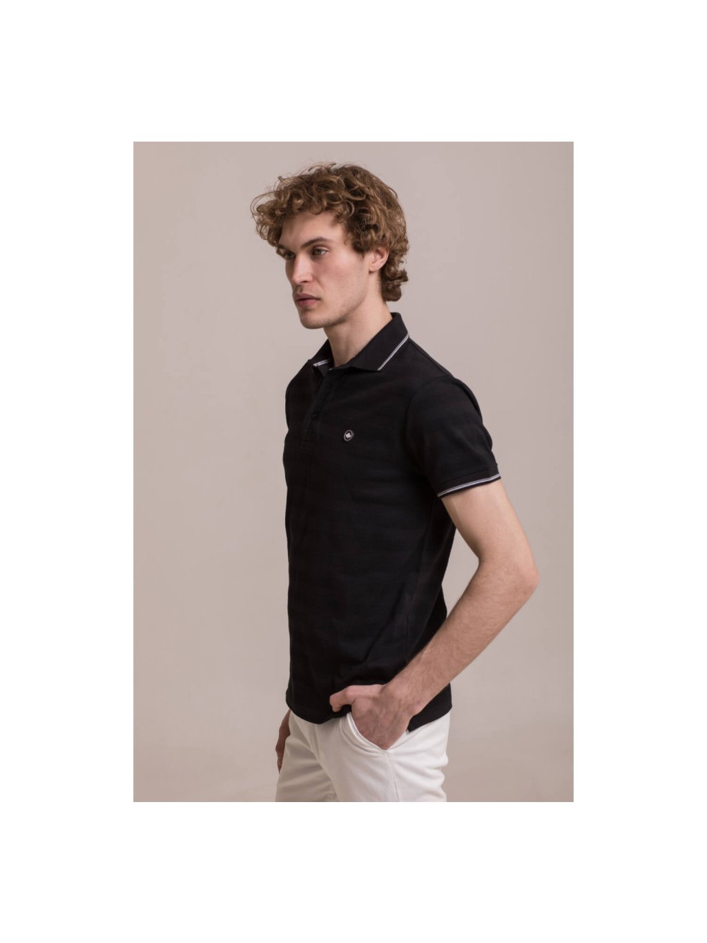 Jednobarevné pánské tričko s tkaným vzorem, z bavlněného žerzeje, černé, s žebrovaným límečkem.